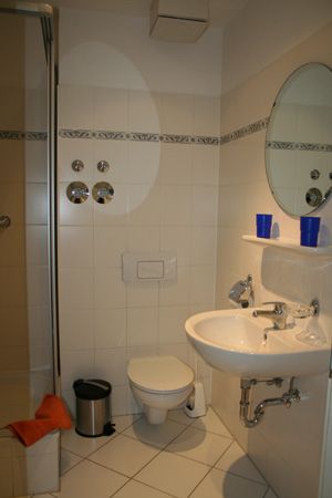 -Das Badezimmer enthält ein Dusche,Föhn, Waschbecken und ein WC.